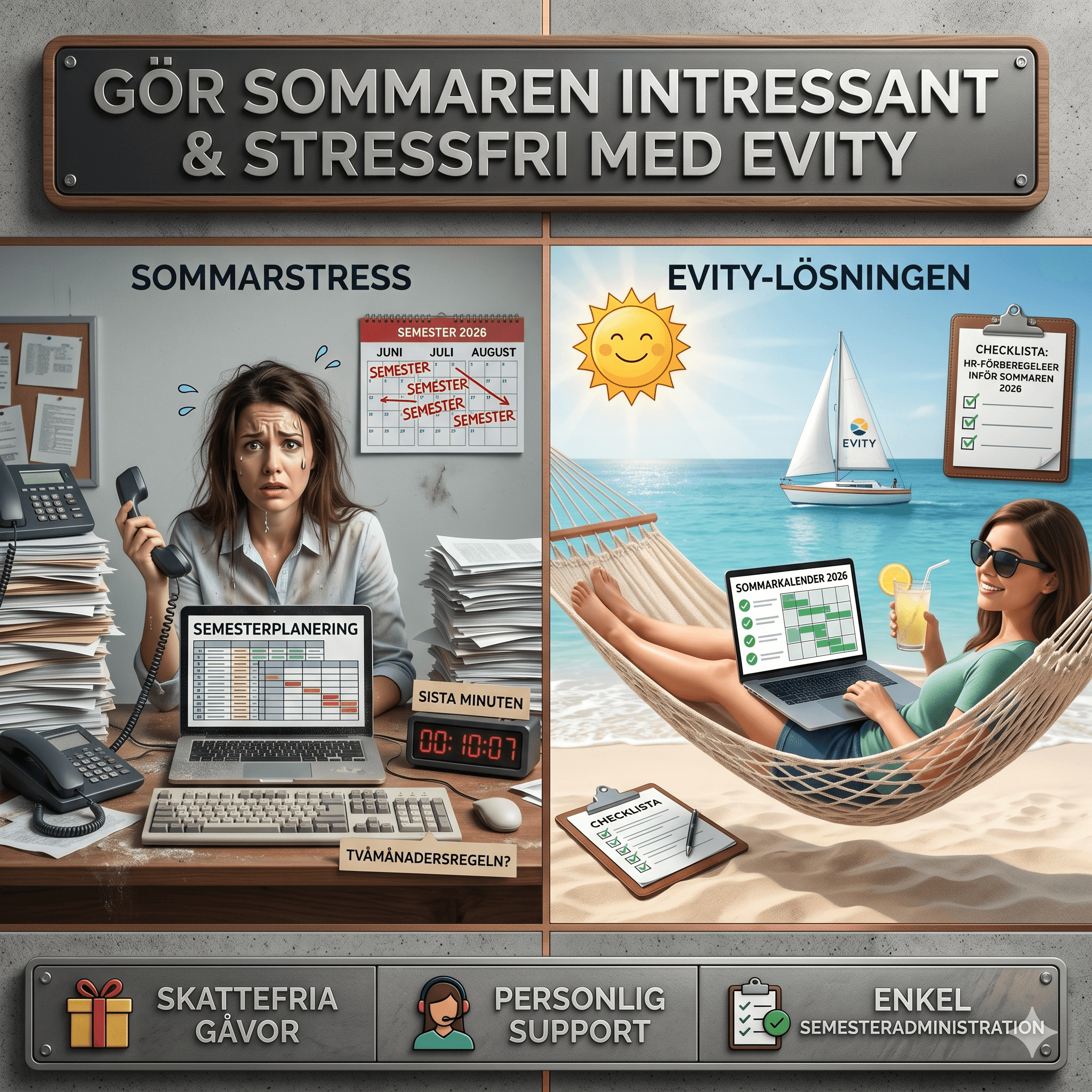 Evity är ett HR-system byggt för små och medelstora bolag som vill ha ordning på medarbetarresan, från onboarding och lönesamtal till kompetensutveckling och offboarding.